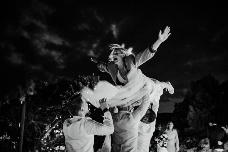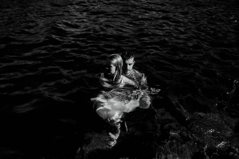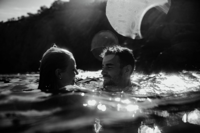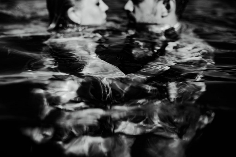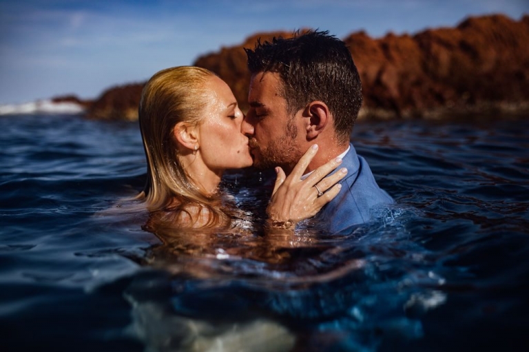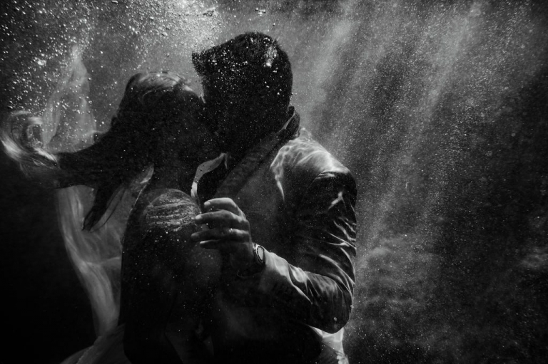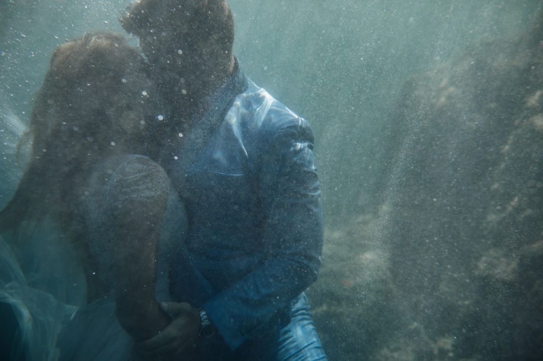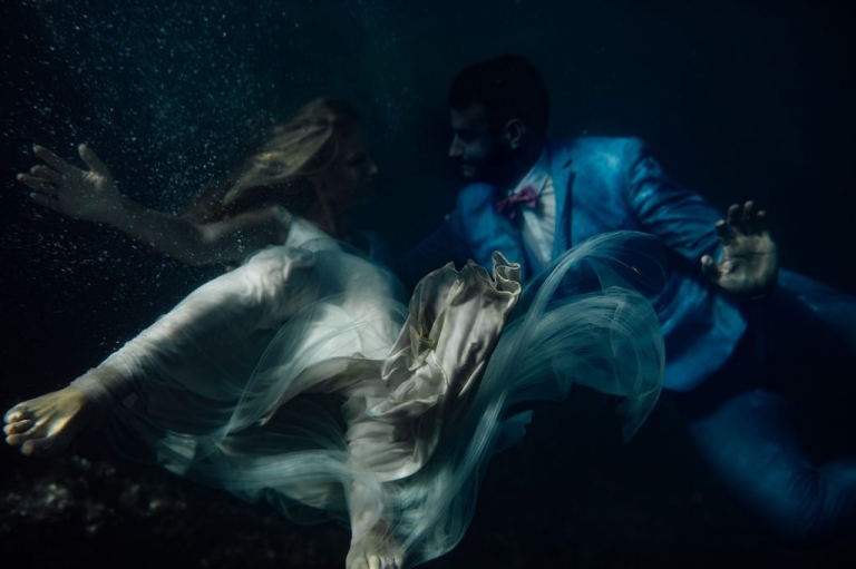 Et, dans l’enthousiasme de la dernière séance photo, les jeunes mariés ont fait le grand saut, cette fois au sens littéral du terme, en se jetant dans la mer. Ma dernière séance photo fut donc sous-marine et grandiose. J’ai pu profiter du mouvement du drapé de la robe de la mariée et des effets de sa mousseline ondulant sous les flots pour en tirer des clichés inoubliables.