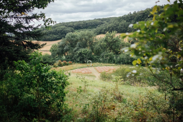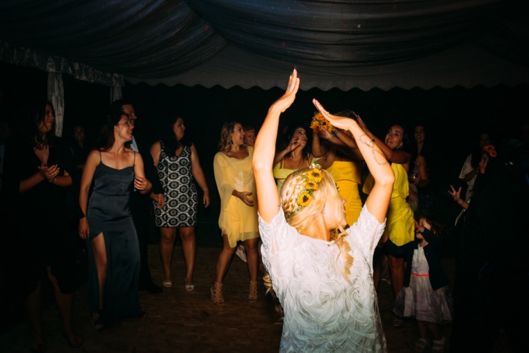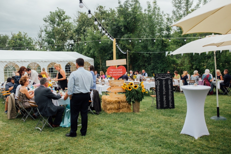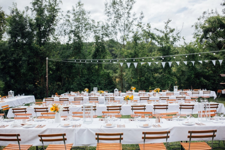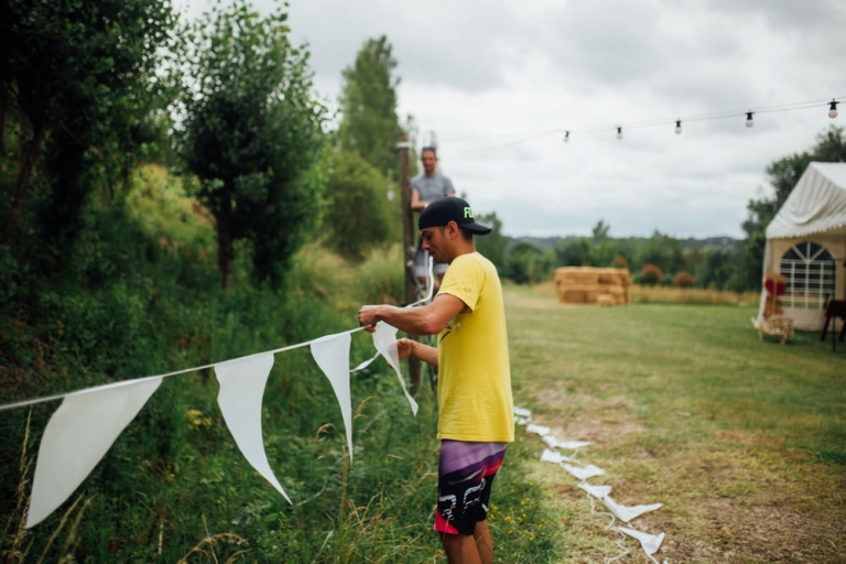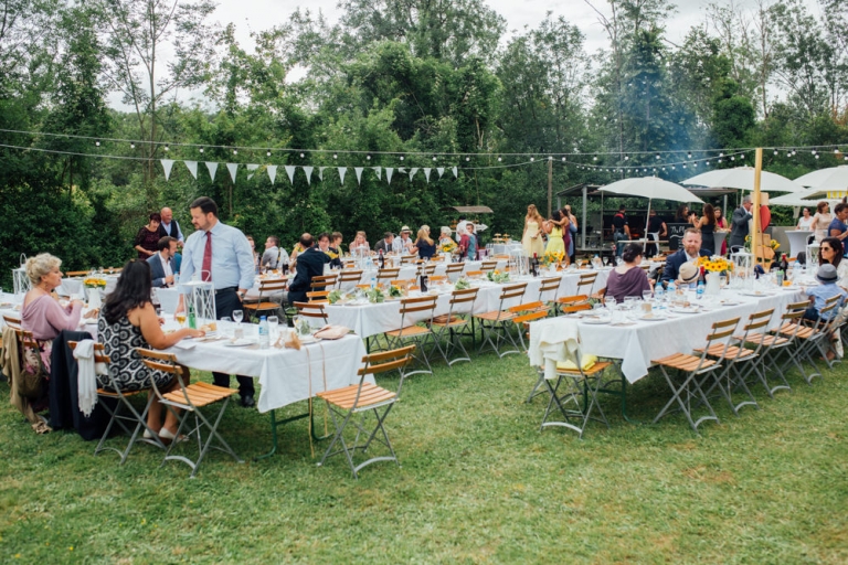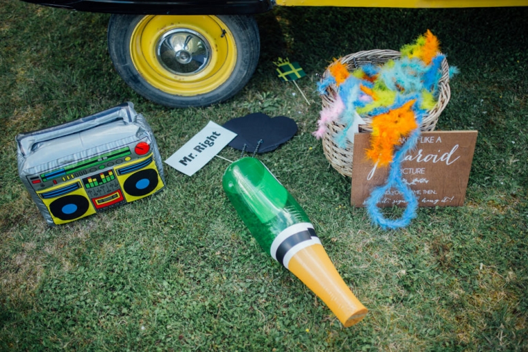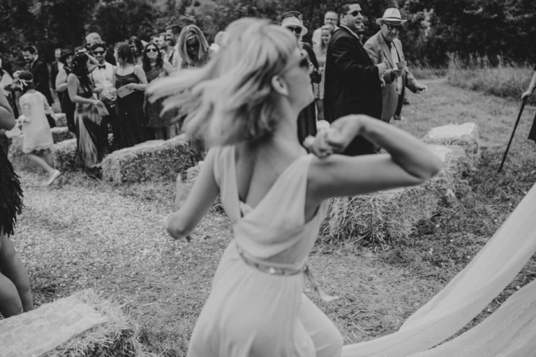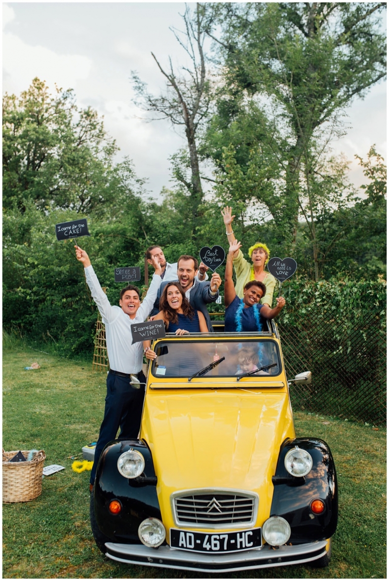 Tout d’abord, il y a eu une cérémonie laïque en pleine air. La décoration pour celle-ci avait rempli tout les codes d’ un mariage champêtre, avec des bottes de pailles, aussi des fanions, des tournesols, également une voiture allemande à traction pour le Photo Booth , ainsi que des guirlandes de guinguette, de même qu’un barbecue, ils ont opte pour cette option plutôt qu’un repas a l’assiette. Et de de surcroît une super ambiance, des rires encore et encore. Plus tard place à la danse ou les maries et les convives on littéralement mis le feu au dance floor.